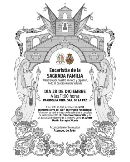 Desde esta página, queremos hacernos eco, a la vez que os invitamos, a la celebración mañana Domingo, 28 de diciembre, de la tradicional Eucaristía en la solemnidad de la Sagrada Familia, que tendrá lugar a las 11:00 horas, en la Parroquia de Nuestra Señora de la Paz; organizada por la Real Cofradía de la Virgen de la Cabeza de Marmolejo.