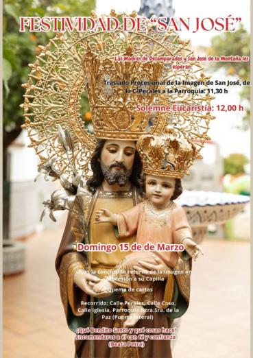 Tras finalizar la celebración el pasado 8 de marzo, los Solemnes 7 Domingos de San José; el próximo Domingo, 15 de marzo, se celebrará la SOLEMNIDAD DE SAN JOSÉ; por tal motivo, desde la Hermandad os queremos transmitir la invitación a los actos y Cultos que la Congregación Madres de Desamparados y San José de la Montaña de la localidad han preparado para dicho día: