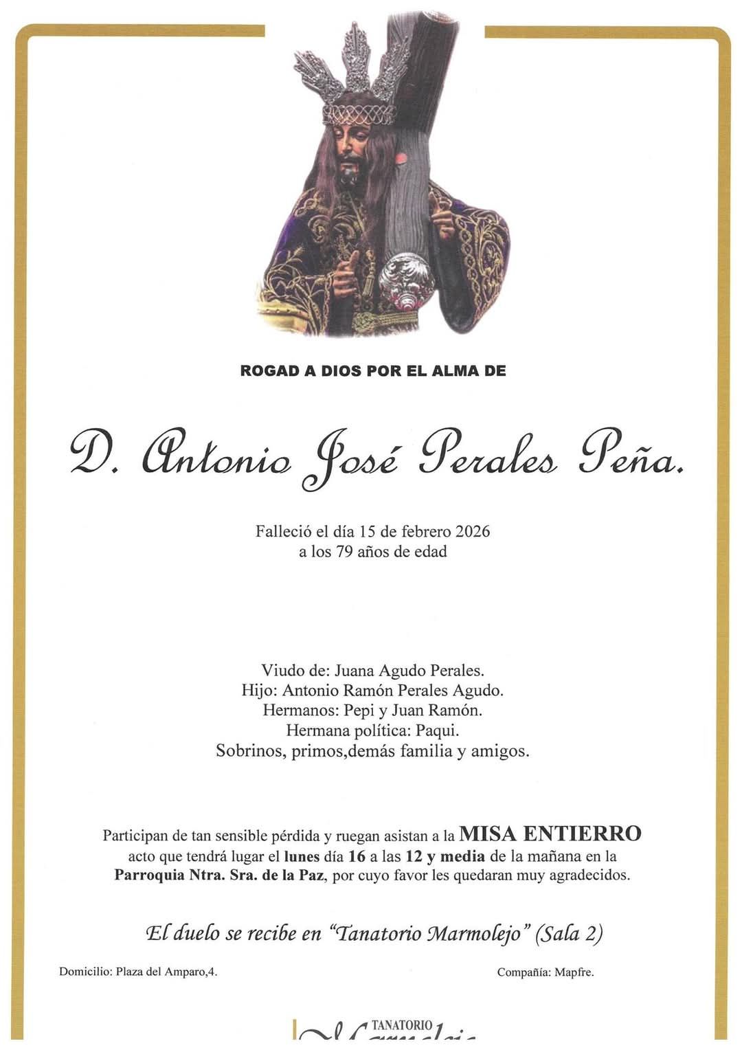 En el dia de hoy, 15 de febrero, nos ha sobrecogido la triste noticia del fallecimiento, de D. Antonio José Perales Peña, hermano de nuestra Hermandad.