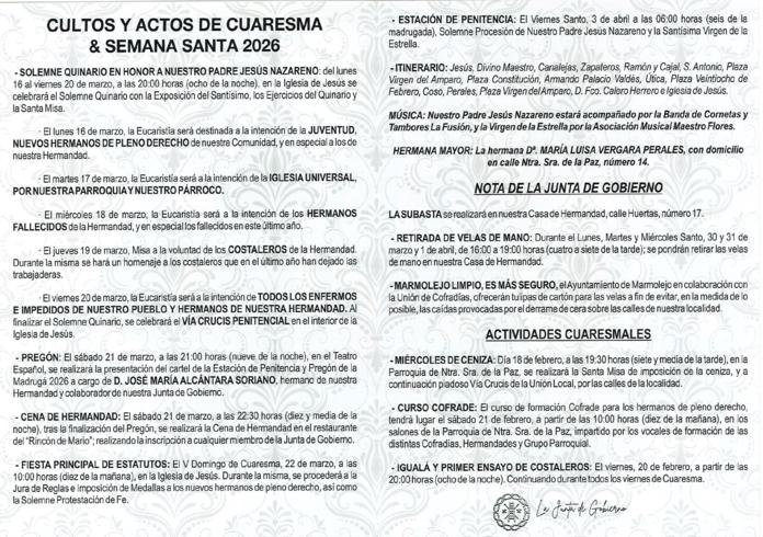 - A las 21,00 horas: en el Teatro Español de Marmolejo, tendrá lugar la PRESENTACIÓN DEL CARTEL DE LA ESTACIÓN DE PENITENCIA 2026 Y PREGÓN DE LA HERMANDAD, a cargo de D. JOSÉ MARÍA ALCANTARA SORIANO, hermano y colaborador de nuestra Hermandad.