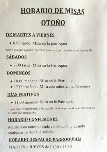 HORARIO DESPACHO PARROQUIAL: MARTES Y JUEVES de 10,30 a 11,30 de la mañana.