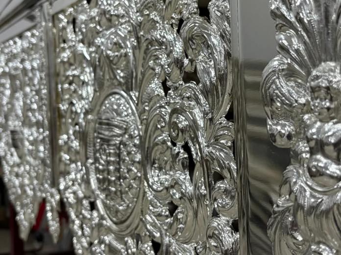 Allí esperaba el ya acabado paso de plata de Nuestra Amantisima Titular, a falta de ultimar algunos detalles y ajustar el patrimonio que la Hermandad ya posee al mismo.