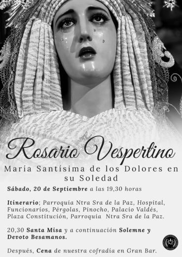 El próximo sábado, 20 de septiembre, a las 19:30 horas (siete y media de la tarde), tendrá lugar el Rosario Vespertino con la Imagen de María Santísima de los Dolores en su Soledad; con el siguiente itinerario, Parroquia de Nuestra Señora de la Paz, Plaza de la Constitución, Hospital, Funcionarios, Pérgolas, Pinocho, Armando Palacio Valdés, Plaza de la Constitución y Parroquia Ntra. Sra. de la Paz.