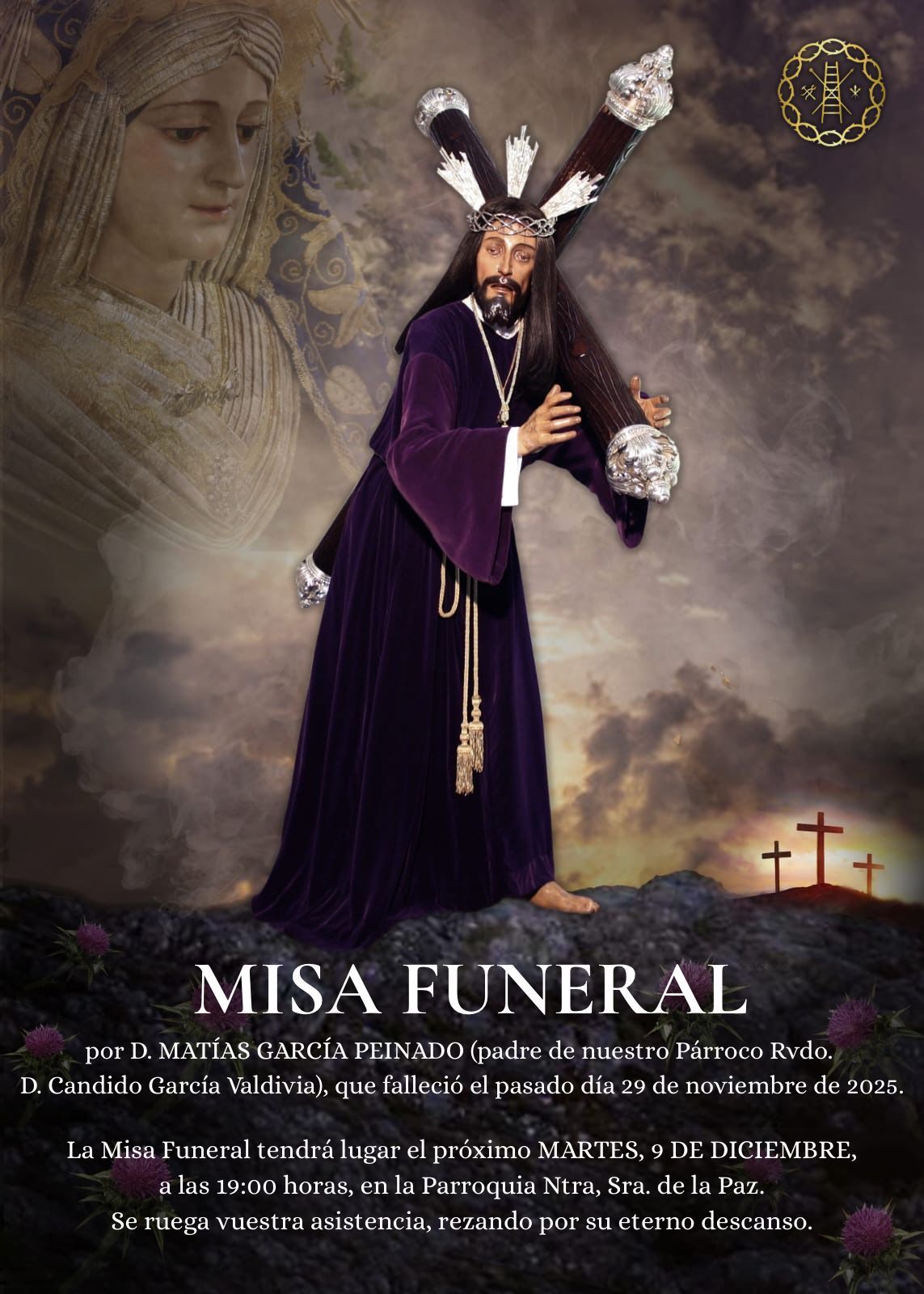 En la mañana de hoy, sábado 29 de noviembre, nos hemos despertado con la triste noticia del fallecimiento de D. Matias Garcia Peinado, padre de nuestro Párroco y Capellán, D. Cándido García Valdivia.