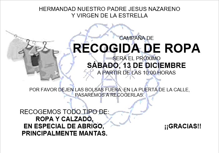 La Vocalía de Caridad de nuestra Hermandad ha retomado la Campaña de RECOGIDA DE ROPA entre nuestros vecinos, la cual será destinada a Cáritas Parroquiales de la localidad; la misma se llevará a cabo el próximo sábado, 13 de Diciembre de 2025, a partir de las 10:00 horas (nueve y media de la mañana); recogiendo todo tipo de ropa, calzado, en especial de abrigo y principalmente mantas.