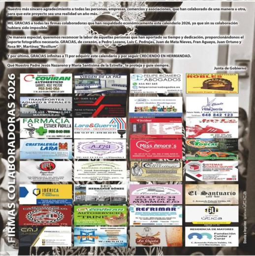 La Hermandad quiere mostrar nuestro más sincero agradecimiento a todas las firmas colaboradoras que cada año hacen posible que este proyecto, que hoy disfrutamos, vea la luz.