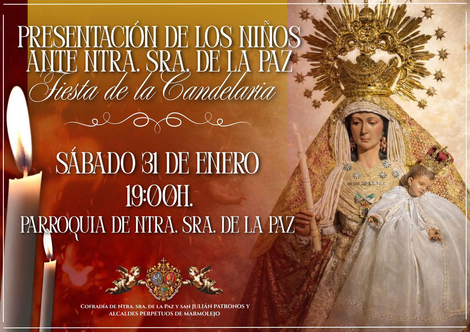 El próximo sábado, 31 de enero, a las 19:00 horas (siete de la tarde), tendrá lugar en la Parroquia de Nuestra Señora de la Paz, organizada por la Cofradía de Ntra. Sra. de la Paz y San Julián; LA PRESENTACIÓN DE LOS NIÑOS ANTE NTRA. SRA. DE LA PAZ; durante la Eucaristía, se presentarán a los niños bautizados en el pasado año; un momento entrañable, donde se pide su protección y amor para todos ellos.