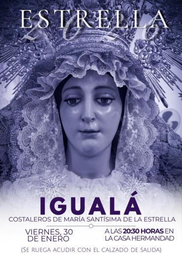 En la tarde-noche de hoy viernes, 30 de enero a las 20:30 horas (ocho y media de la noche), en nuestra Casa Hermandad, sito en calle Huertas, 17, tendrá lugar la convocatoria para la igualá de costaleros del paso de Nuestra Titular.